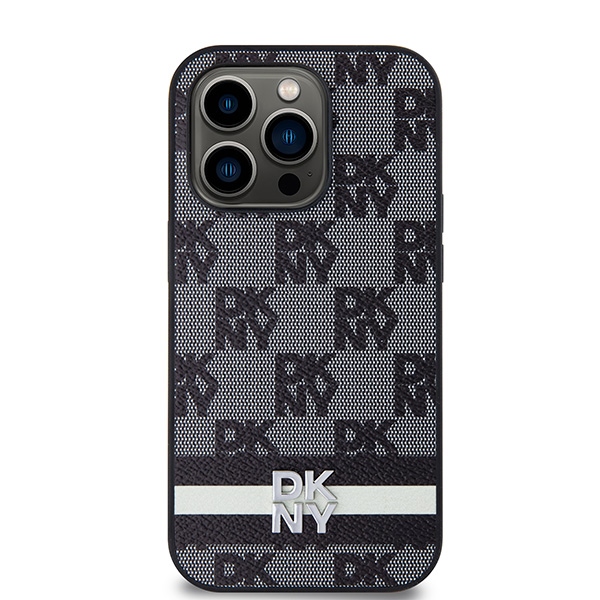 DKNY Leather Checkered Mono Pattern & Printed Stripes ir izsmalcināts aizsargvāciņš, kas apvieno Ņujorkas enerģiju ar klasisku eleganci, nodrošinot jūsu iPhone 14 Pro unikālu izskatu.