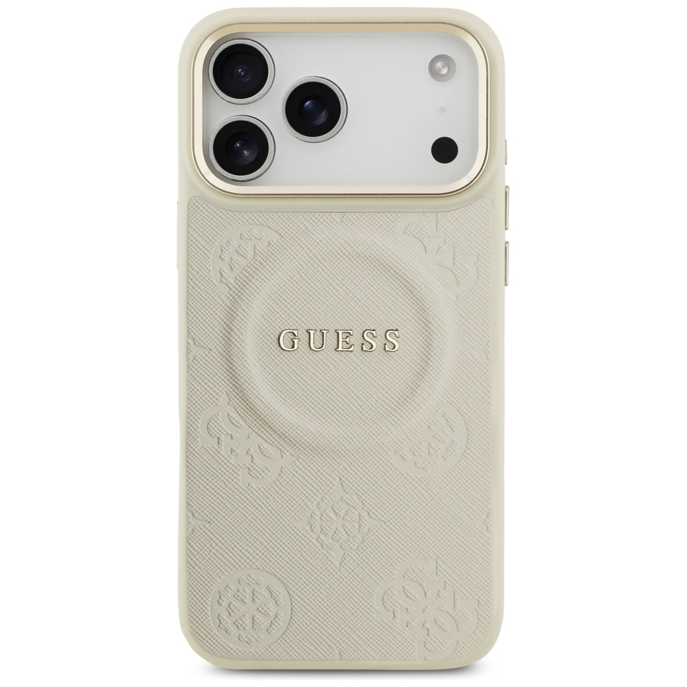 Paceļ savu iPhone 17 Pro Max stilu ar Guess Peony Hot Stamp MagSafe maciņu bēšā tonī — luksusa dizains un uzticama ikdienas aizsardzība.