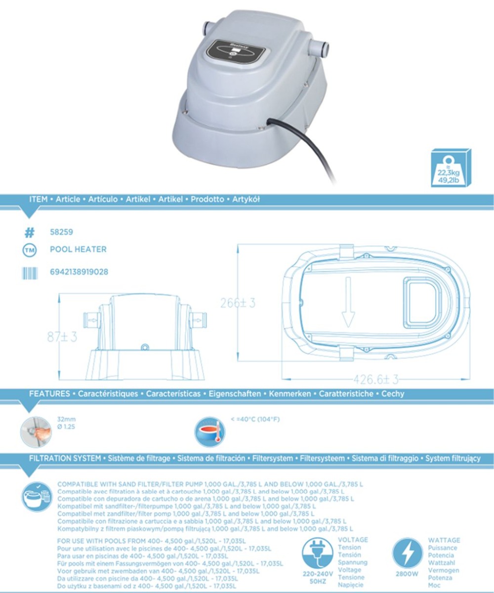 BESTWAY 58259 Elektriskais baseina ūdens sildītājs, līdz 3785l/h l Electric Pool Water Heater