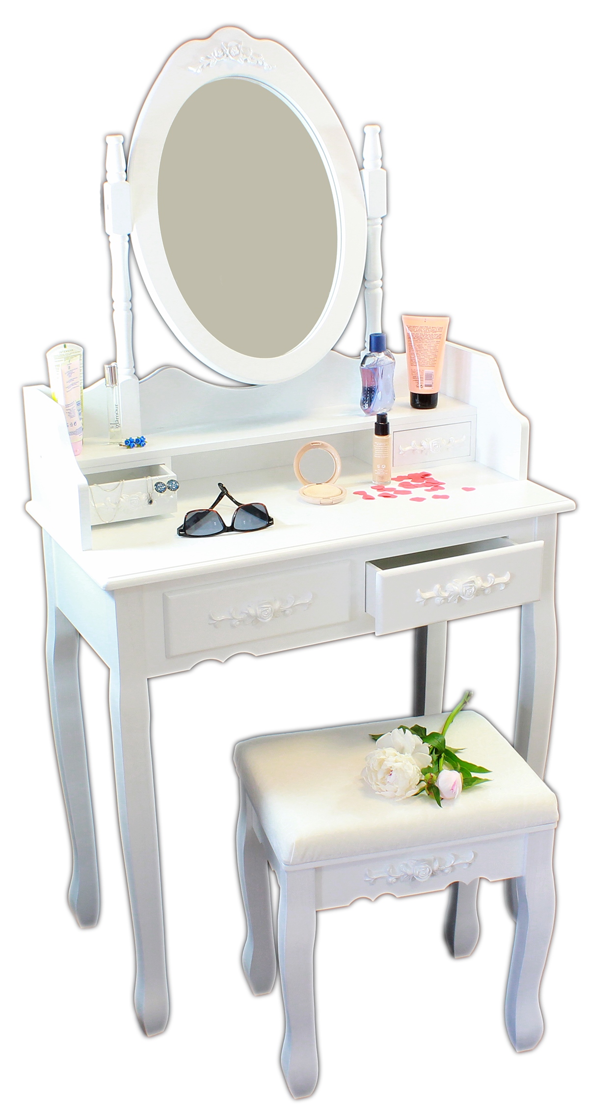 Atklājiet savu ideālo skaistumkopšanas stūrīti ar mūsu eleganto kosmētikas galdiņu. Komplektā ar lielu spoguli un ērtu krēslu, tas ir viss, kas nepieciešams.