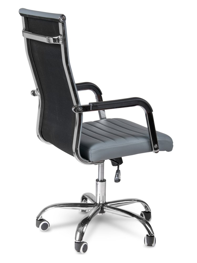 Krēsls ir aprīkots ar hromētiem roku balstiem un mīkstu sēdekli, kas pārklāts ar patīkamu eko ādu. Īpaši profilētā atzveltne nodrošina ērtu atbalstu mugurkaula jostas daļai, garantējot maksimālu lietošanas komfortu. Hromētā piecu staru pamatne ar plati izvietotiem ritentiņiem atvieglo pārvietošanos un nodrošina krēsla stabilitāti.
