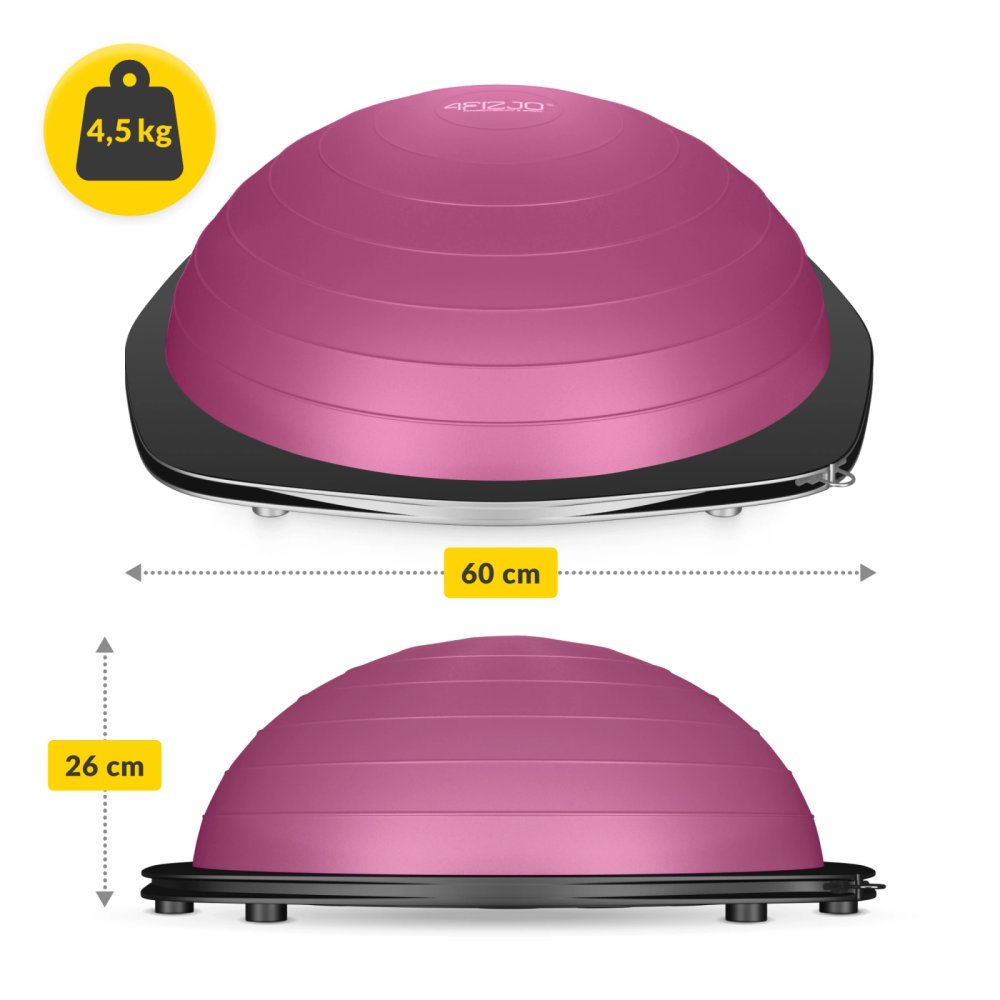 4FIZJO līdzsvara pusbumba ir vingrošanas bumbas puses un līdzsvara platformas apvienojums. Šāda konstrukcija sniedz virkni priekšrocību – abas puses ļauj veikt daudzveidīgu treniņu. Pusapaļais kupols un pamatne ir izgatavoti no augstas kvalitātes materiāla, kas nodrošina izturību. Pretslīdes risinājumi, piemēram, kājiņas un īpašas ovālas līnijas, garantē drošību vingrinājumu laikā. Tie pasargā no paslīdēšanas un novērš platformas pārvietošanos fizisko aktivitāšu laikā. Komplektā ar līdzsvara trenažieri ir iekļauti 2 noņemami espanderi un pumpis.