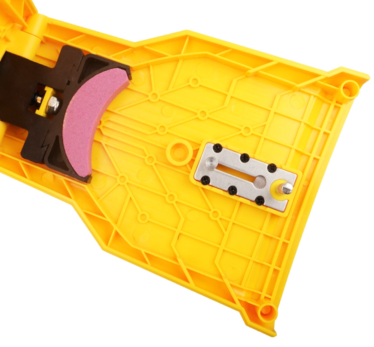 Compact chain saw sharpener. Made of lightweight and durable plastic, which allows you to quickly sharpen the in a break from work. The sharpener is compatible with most chainsaws (i.e. 14'' 16'' 18'' 20''). Tool has two mounting brackets, one is adjustable to fit chains different types.