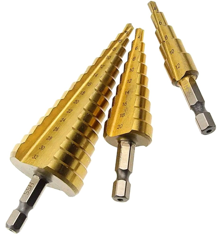 A set of 3 ground high-speed steel (HSS) drill bits coated with a reinforcing titanium coating. They are perfect for machining thin sheet metal, plastics and any metal without iron content in the alloy. Graduated 2 mm increments (with diameters from 4 to 32 mm). have standard HEX-type handle laser-cut numbering.