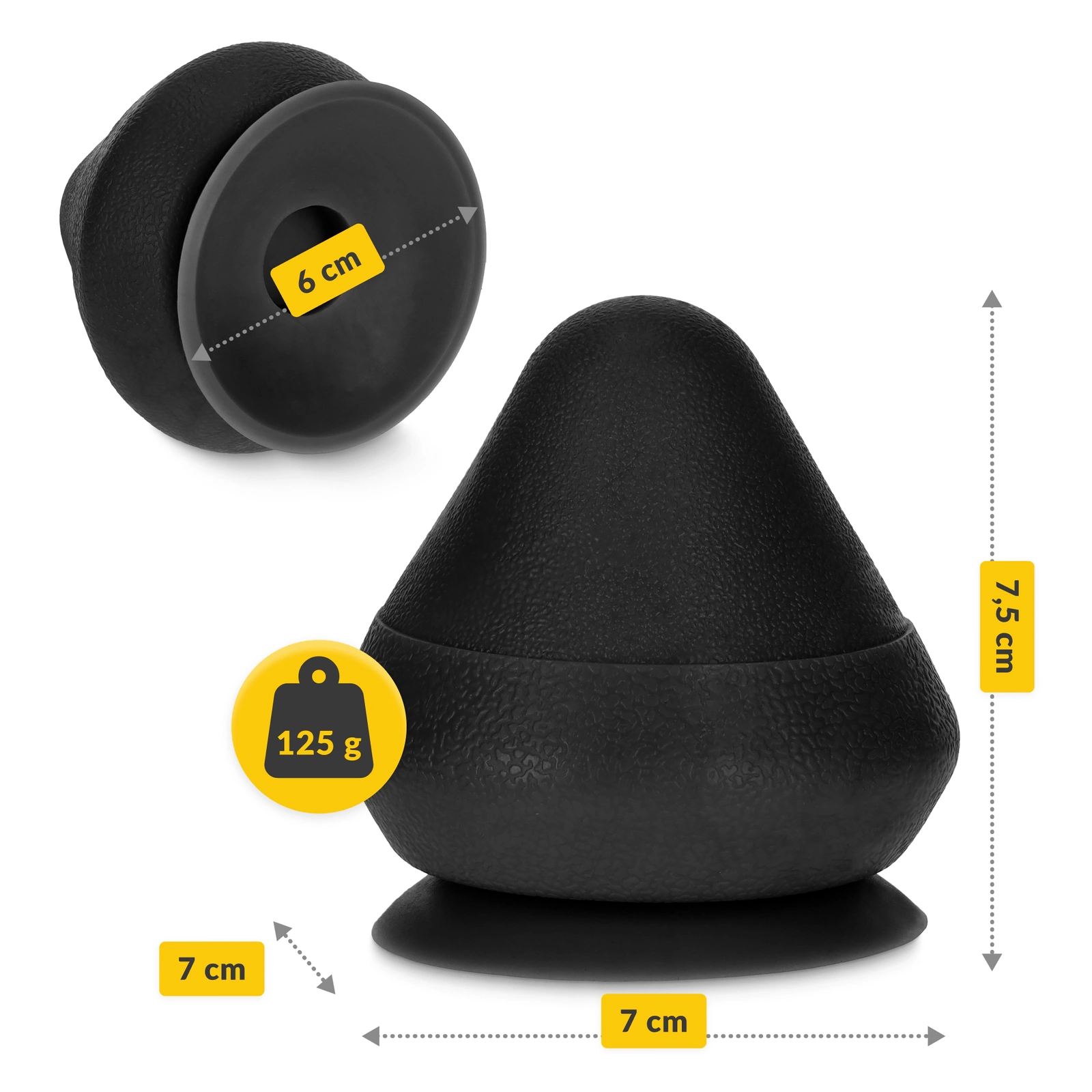 Thanks to its special cone shape and optimal hardness, this massage tool allows for precise action on painful points. It can be used to massage feet, hands, back, neck, legs, and buttocks. A convenient suction cup at the base allows you to attach the cone to a wall or other smooth surface for easy access to hard-to-reach areas on the back.