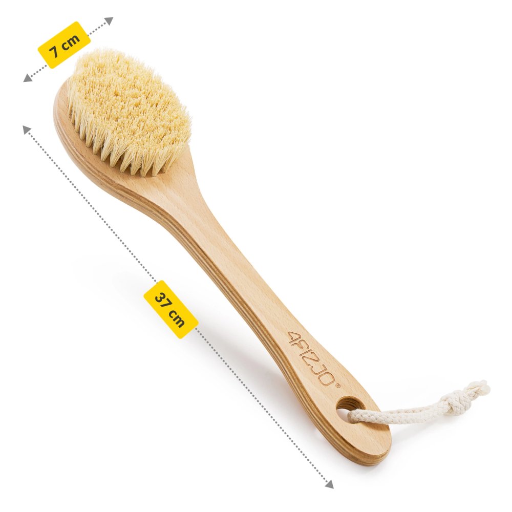 The 4Fizjo 603 is a long bamboo brush with hard natural bristles, designed for both dry body brushing and use in the bath or shower.