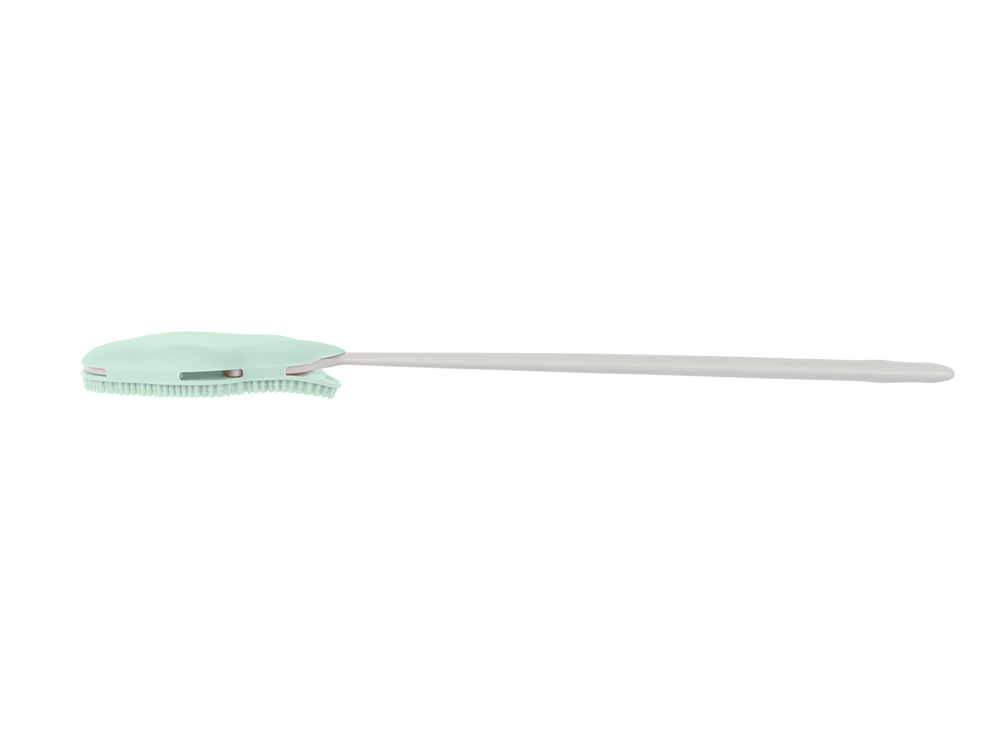 The silicone body wash brush with a long handle is a practical bathroom accessory designed for convenient body washing, especially the back, and massage.