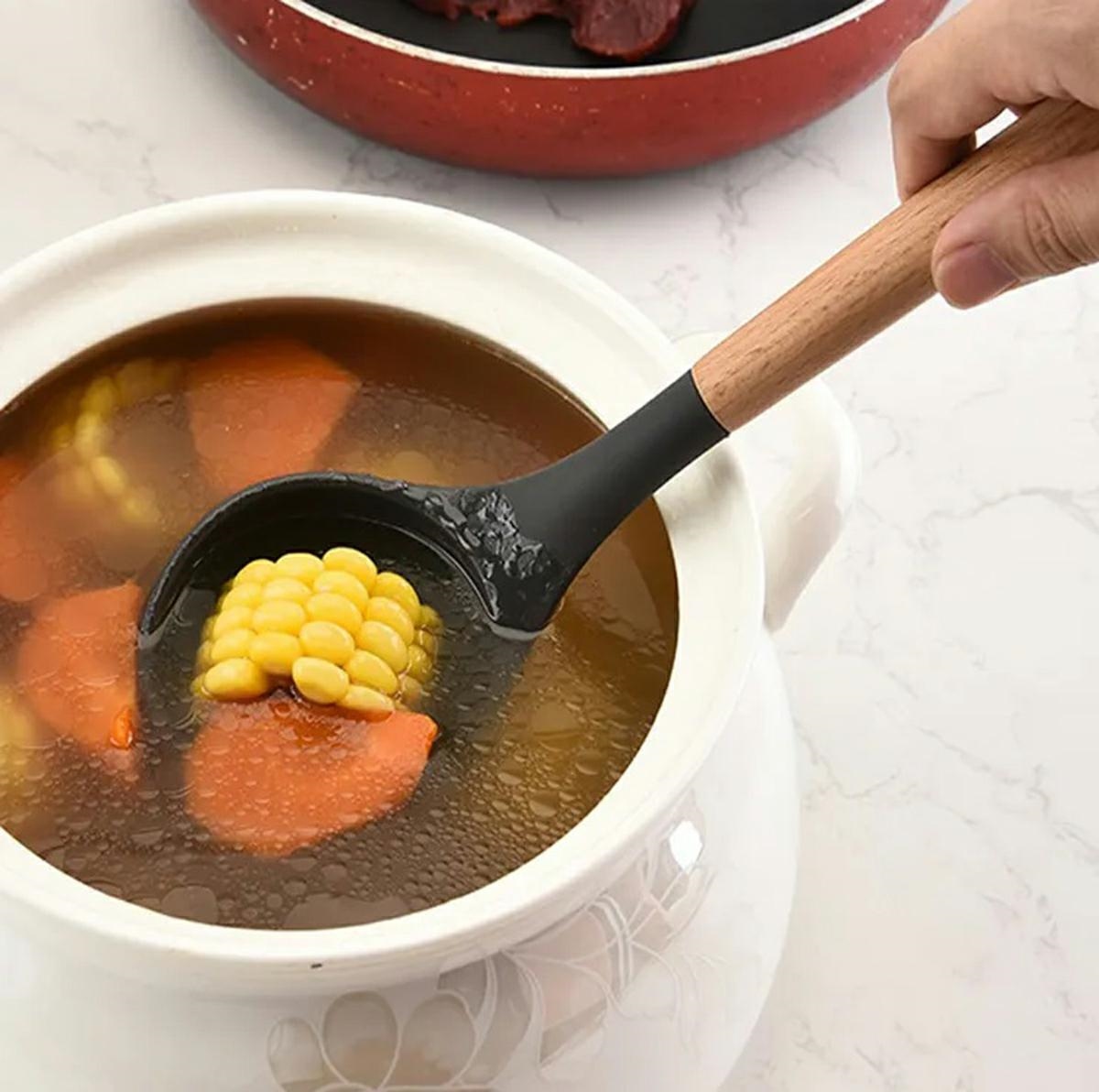 The utensils are heat-resistant and safe for food contact. The silicone tips protect pans and pots from scratches, while the wooden handles provide a comfortable grip. The set also includes a practical container that serves as a drainer and storage.
