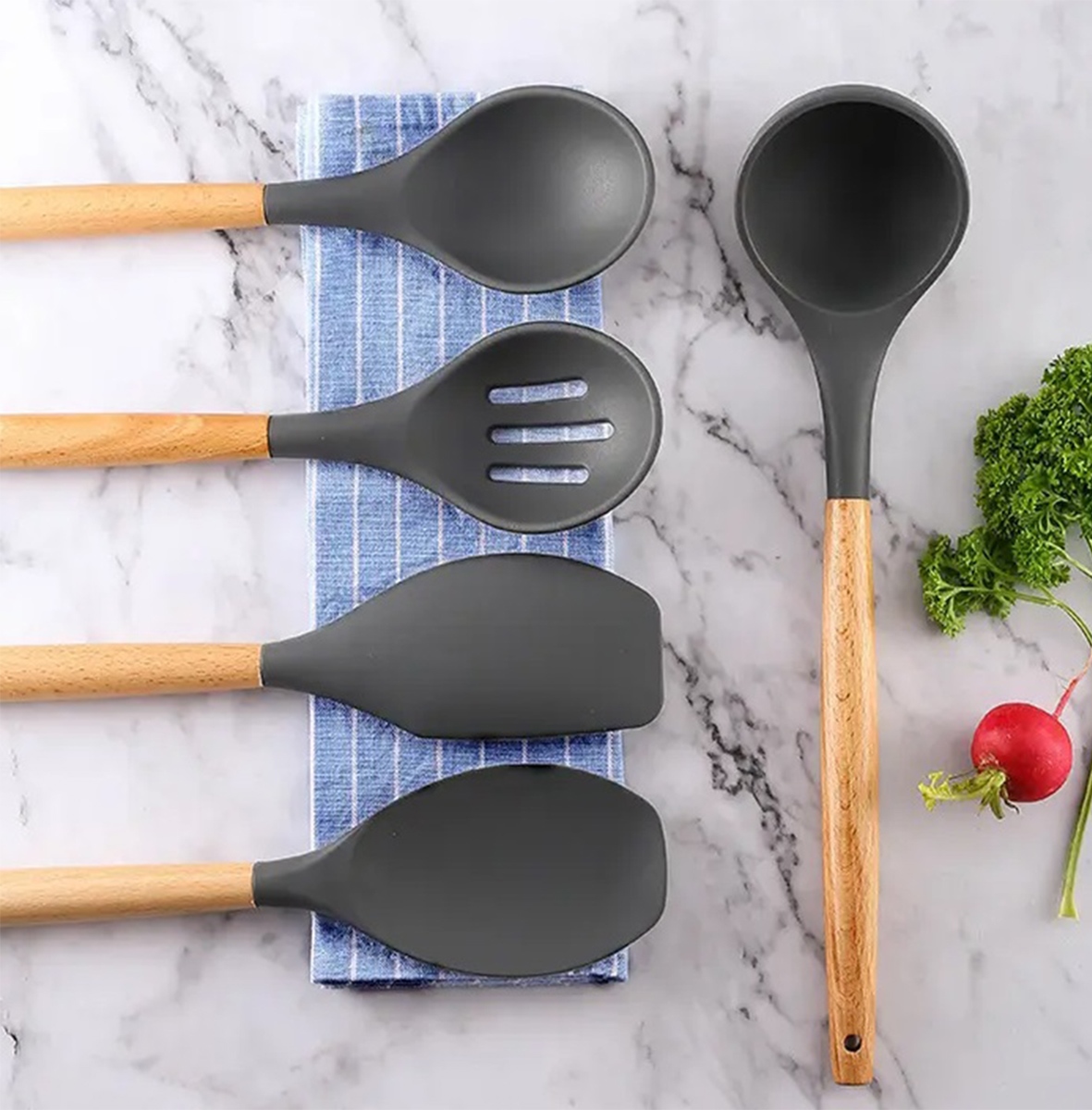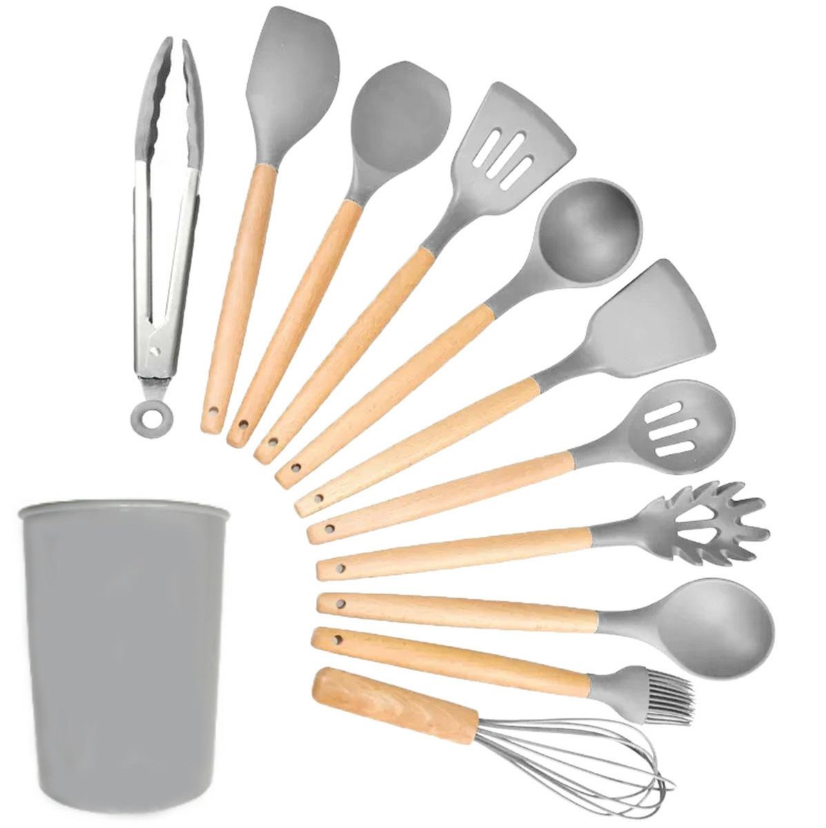 Kitchen Utensil Set, 12 Pieces, Wood and Silicone, Grey