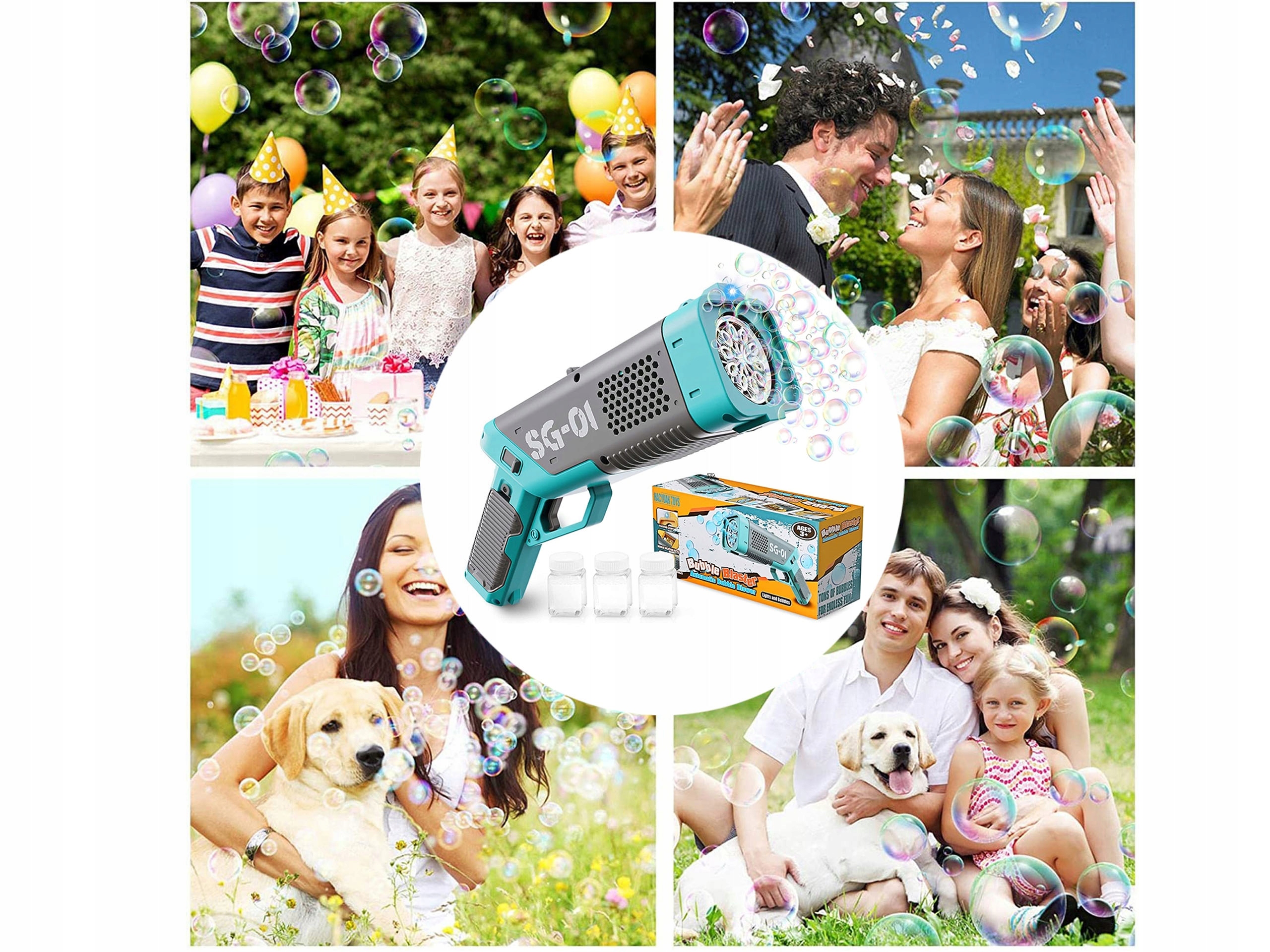 Automatic machine for soap bubbles - gun. The toy has 3 interchangeable tanks with liquid. The gun produces a large number of bubbles and blows them out with a fan.