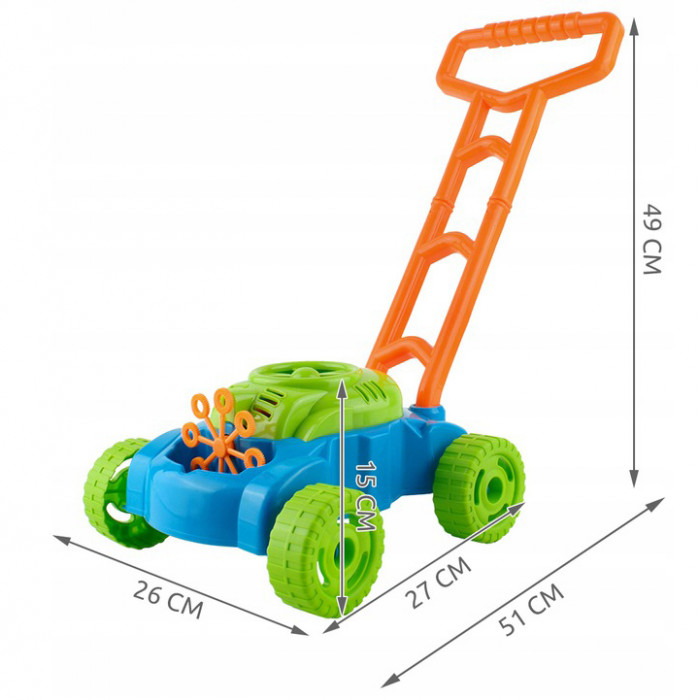 Beautiful sunny weather, green grass and a magical lawn mower blowing soap bubbles. Soap machine in the form of a lawn mower will win the heart of every kid. The mower is equipped with 8 rings that are immersed in the liquid while the toy is moving, and a small fan that produces air flow causes colorful soap bubbles to appear.