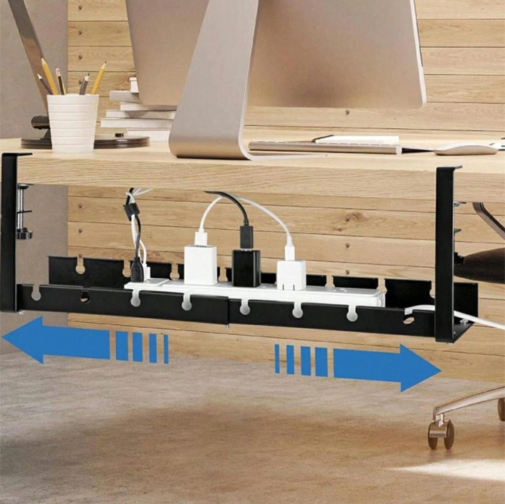 An adjustable cable organizer designed to be mounted under a desk, helping to maintain a tidy workspace and hide wires and power strips.