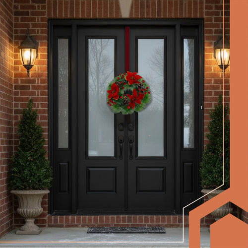 This 30 cm diameter wreath is decorated with artificial pinecones, red berries, and flowers, creating a realistic and rich look. It requires no maintenance and retains its shape for years.