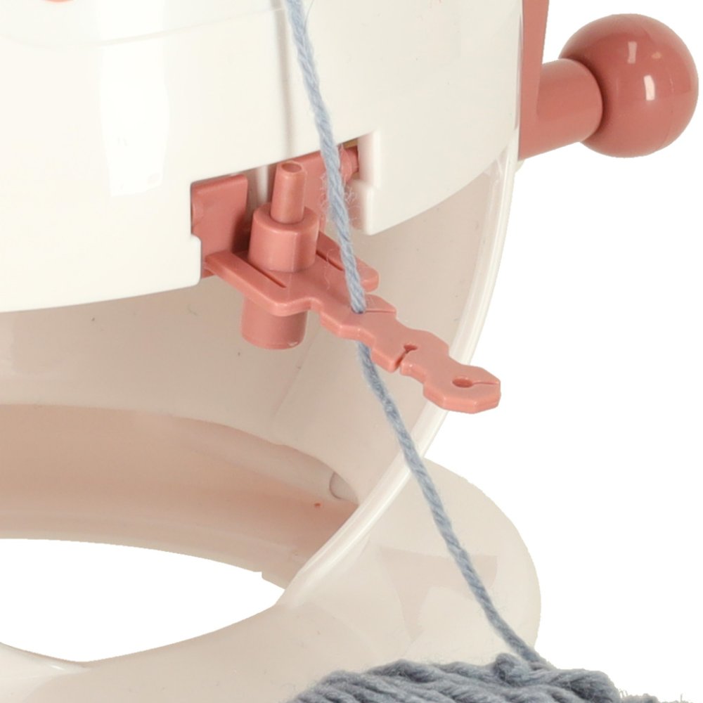 The device operates entirely manually by turning a crank, meaning no batteries are required. It supports both flat and circular knitting, allowing children to easily make hats, scarves, and other accessories while developing patience and fine motor skills.