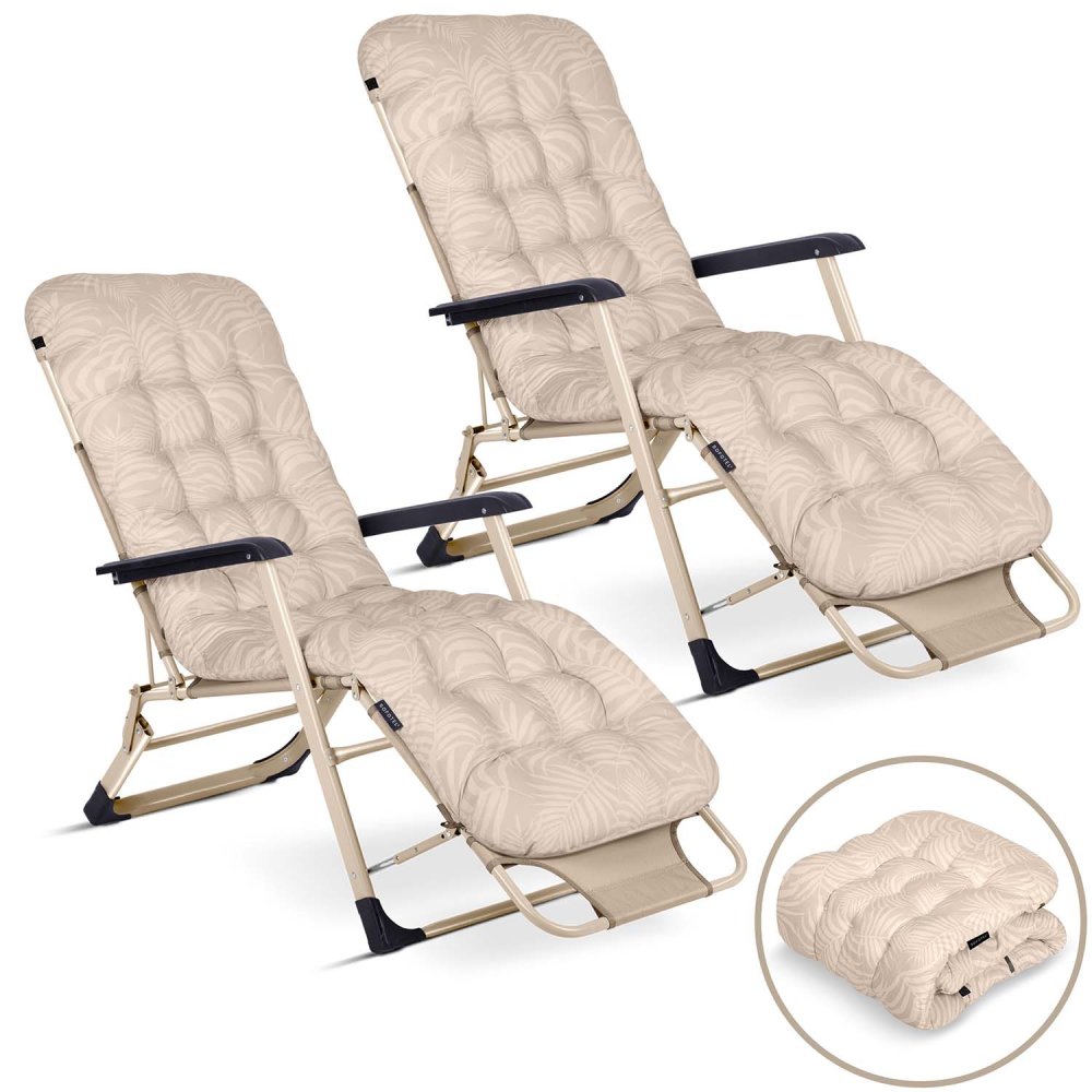 The Sofotel Chillwell folding garden sun lounger is an excellent choice for relaxing in the garden, on the terrace, or at the beach. The set includes two loungers with soft beige cushions and headrests, providing maximum comfort and relaxation outdoors.