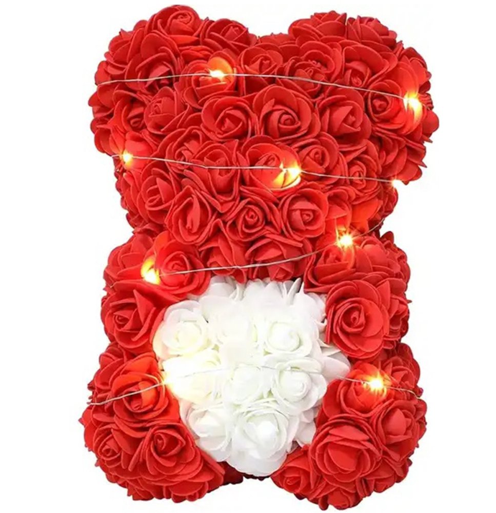 A charming decorative bear made of red roses holding a white heart. This unique gift combines the beauty of flowers with a warm LED glow, making it a lasting keepsake.