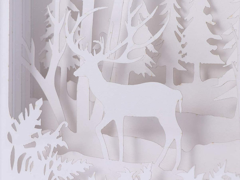 The lamp uses creative paper cutouts which, combined with white, yellow, and blue lighting, create an impressive three-dimensional landscape effect. It is safe to use, has no sharp edges, and can be powered by either a USB cable or batteries.