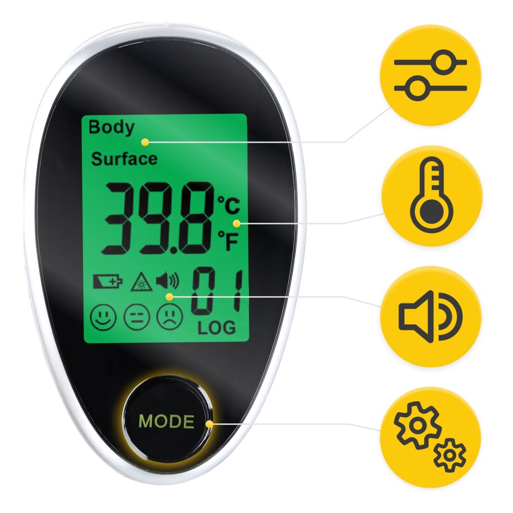 - Color Indicator: Green (normal), orange (slight fever), and red (fever) screen backlight.
