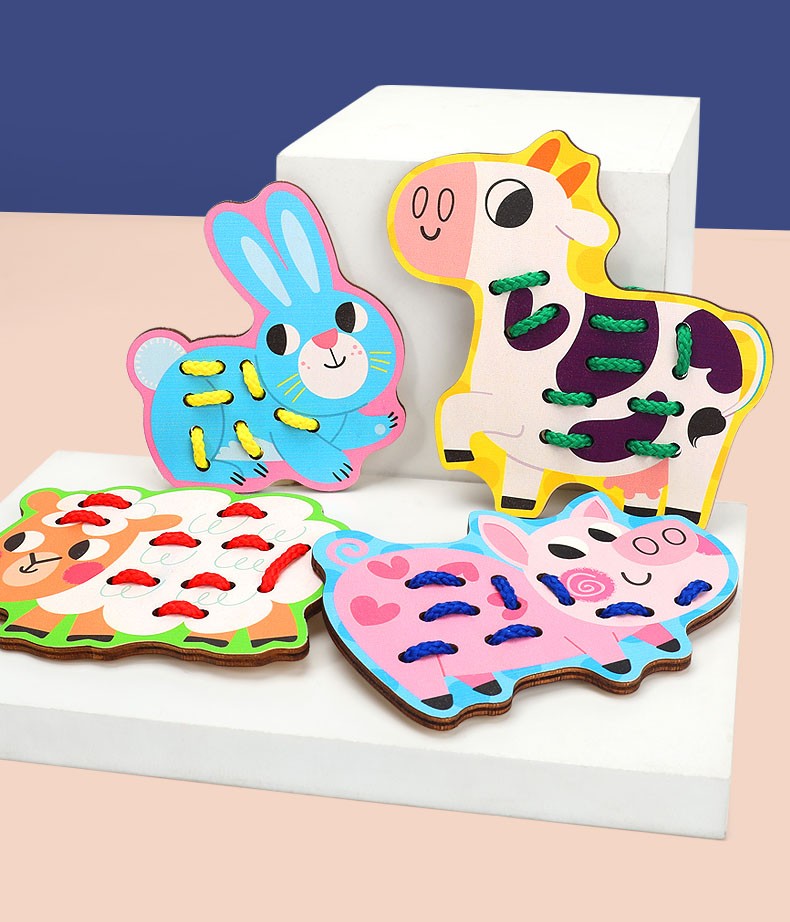 Colorful set with animals to play intertwining strings. Through play, the child develops his manual skills and eye-hand coordination.