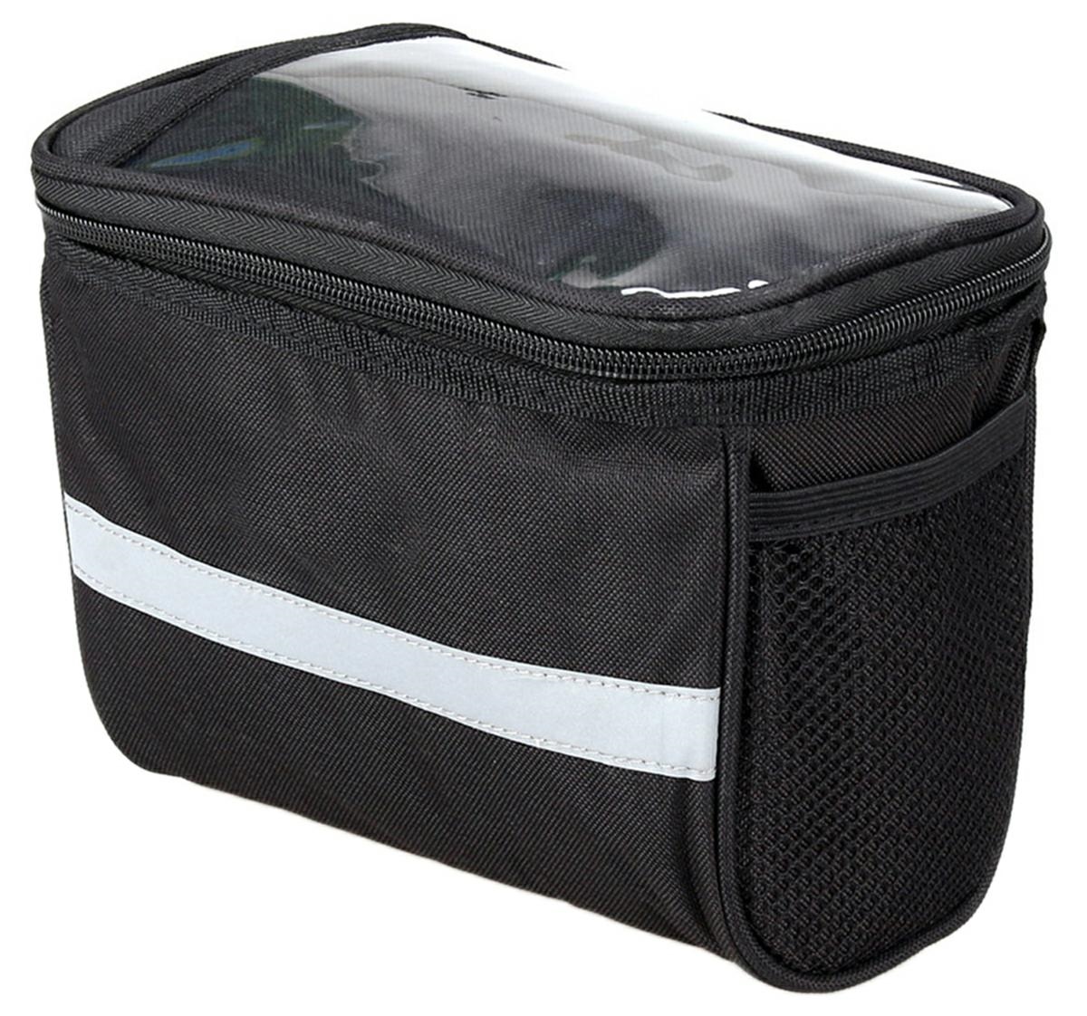 Spacious and durable bike handlebar bag made from waterproof, easy-to-clean polyester. Perfect for both short and long rides, keeping your essentials organized and within reach. Features a large main compartment with zipper closure, two mesh side pockets, and a separate pocket for a map or smartphone. Reflective details enhance visibility and safety after dark. Easily attaches to the handlebar with adjustable Velcro straps.