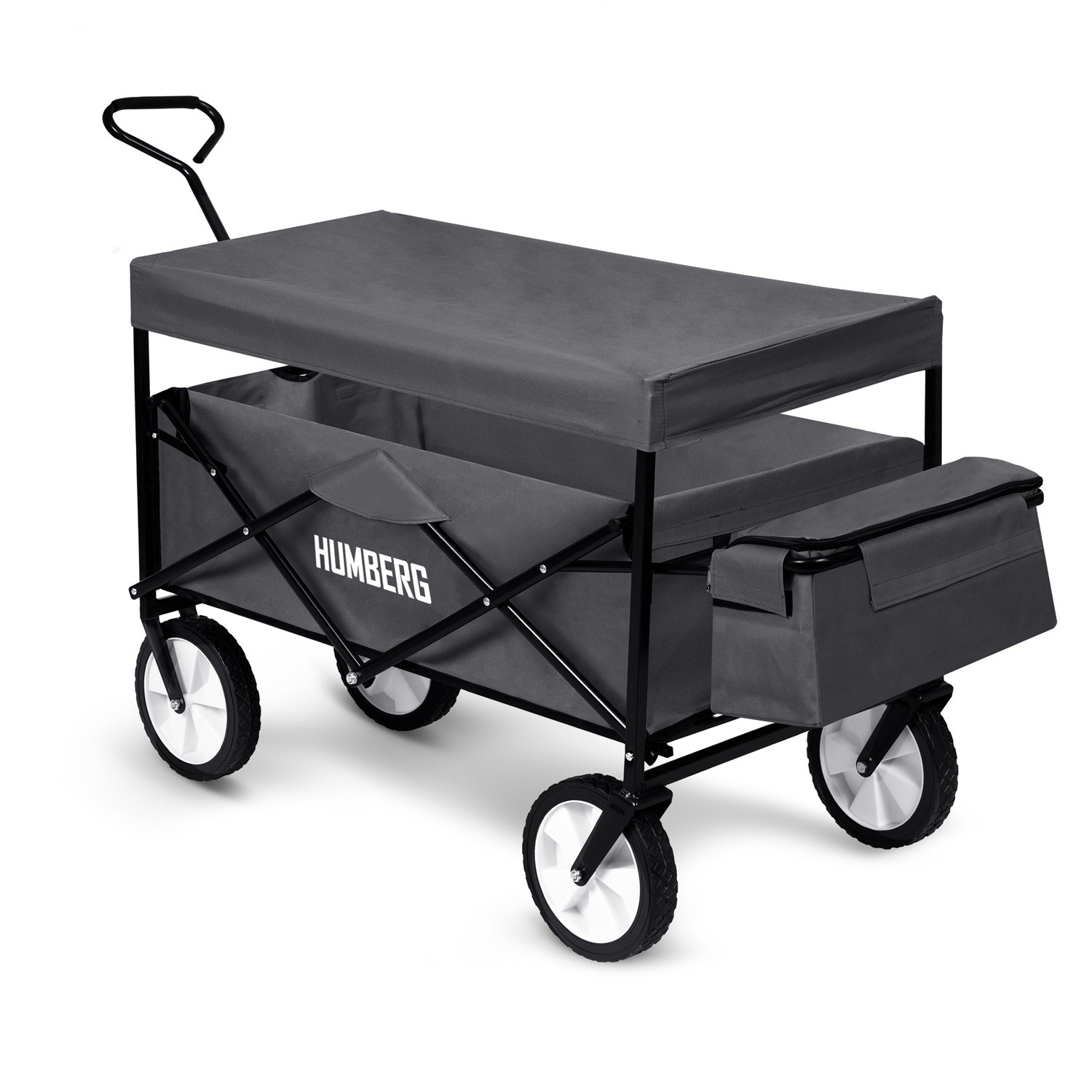 The Humberg folding transport cart is a practical helper in the garden, on trips, or for everyday tasks. It offers an 80-liter capacity and an adjustable canopy to protect your cargo from the sun and rain.