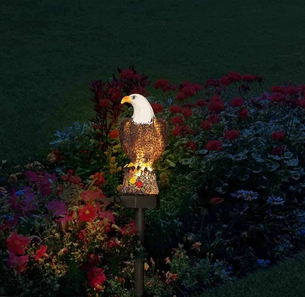 Unique solar-powered garden LED lamp shaped like an eagle – a striking decorative accent for your garden, pathway, or steps. The lamp uses a polycrystalline solar panel to charge its built-in battery during the day. Thanks to the dusk sensor, it switches on automatically at nightfall. A full charge provides up to 8 hours of continuous warm white illumination. The sturdy ground spike ensures quick and secure installation, while the waterproof housing (IP67) guarantees reliable outdoor use in all weather conditions.