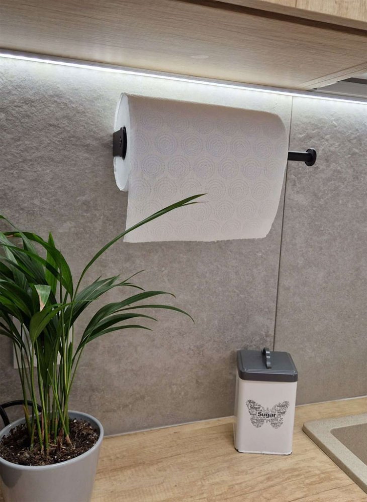 A practical and elegant black metal holder for kitchen paper towels. It helps save space on your countertop and ensures that a paper towel is always within reach.