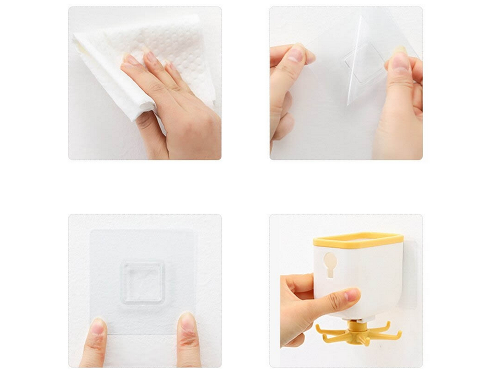 The hanger is mounted with adhesive backing, making installation quick and easy. It features 6 rotating hooks that can turn 360 degrees and two mounting options for hooks inside the container. Clean and degrease the surface before mounting for best results.