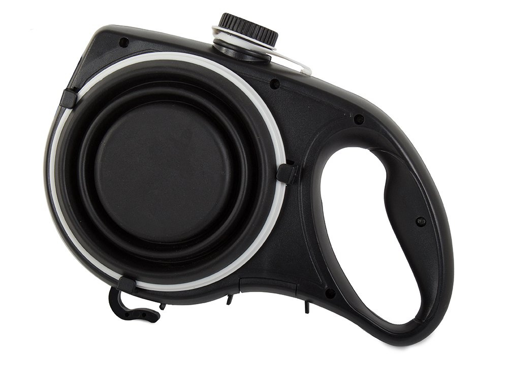 Practical leash with integrated water bottle, foldable silicone bowl, and waste bag holder — perfect for long walks, training, or travel with your dog or cat.