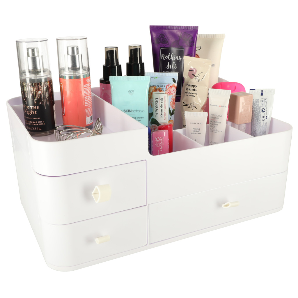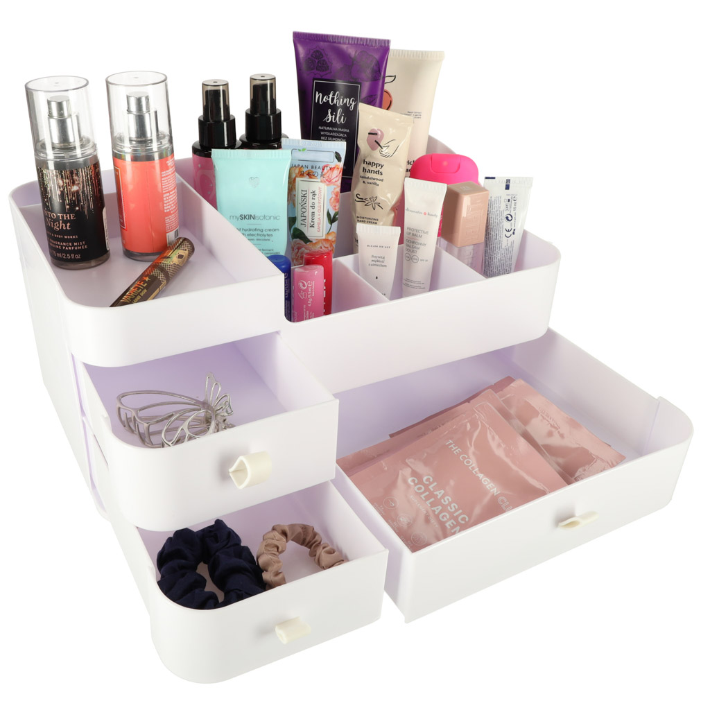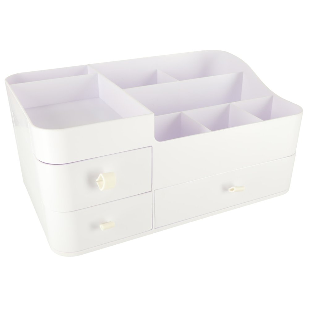 A large and spacious organizer for cosmetics and jewelry that helps keep your dressing table or bathroom tidy. It features drawers and various sized compartments for convenient storage.