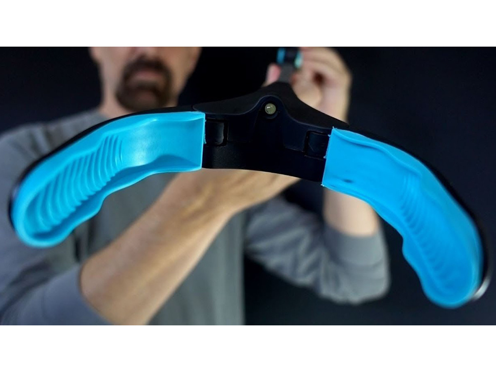 To unfold and fold the gripper, press the blue button located where the unit is folded. Unfolding without pressing the button may damage the unit, preventing it from locking in the unfolded position.