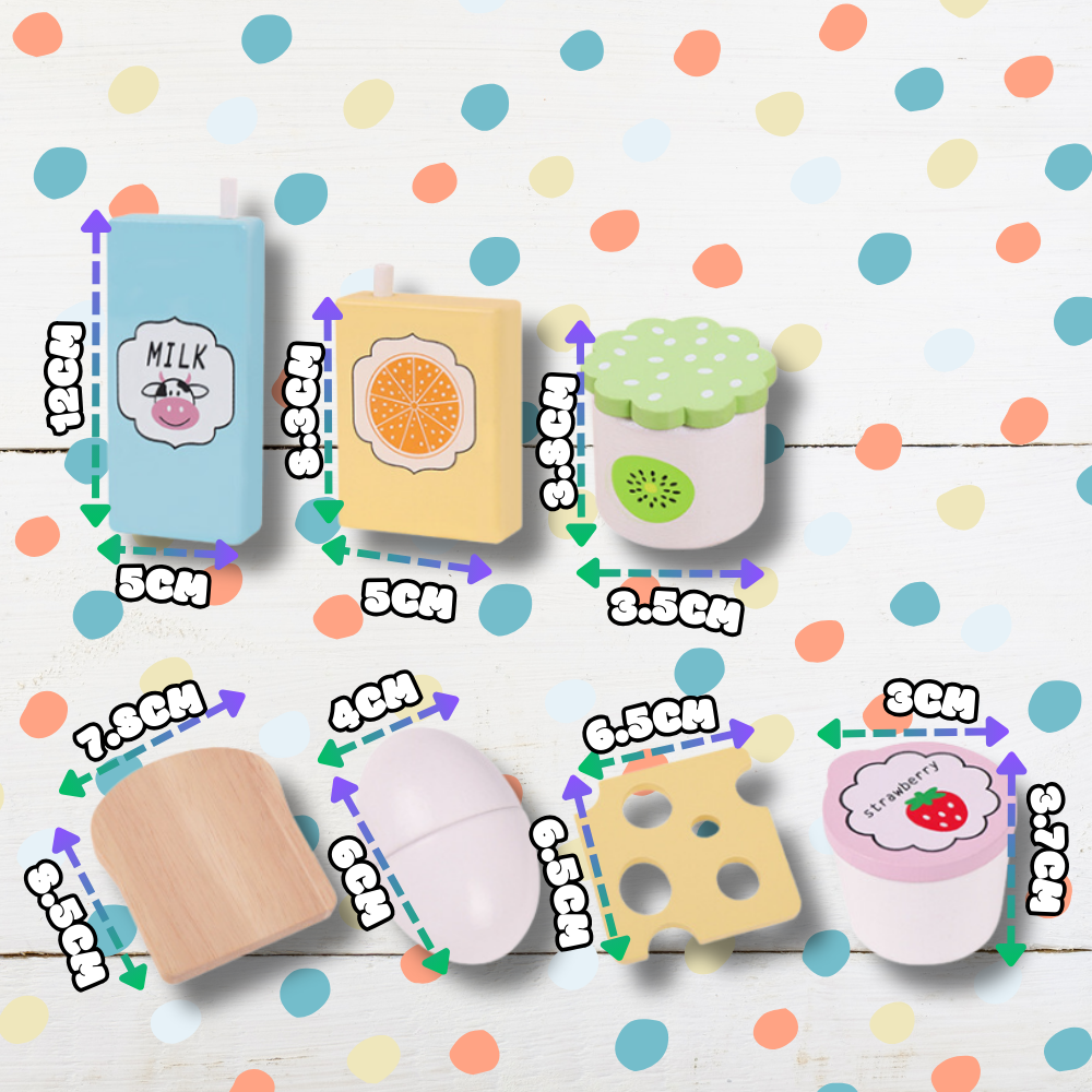 The set includes a wooden slice of bread, cheese, two jam jars, orange juice, milk, and a sliceable egg.