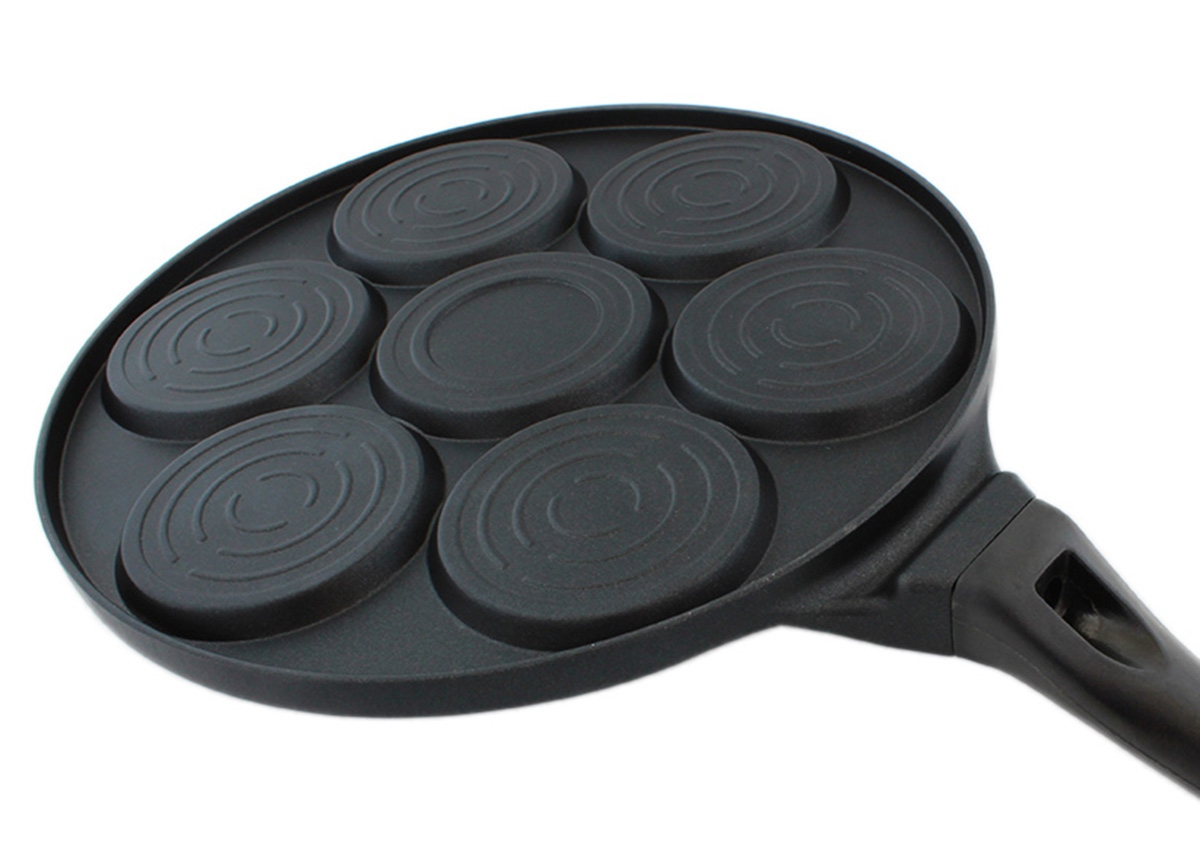 Sturdy flat pan for eggs and pancakes. Allows you to fry up to 7 eggs or pancakes at the same time! Made from durable marble (non-stick) coating. Equipped with a long, non-heating handle that can be hung on the wall. Suitable for both classic gas and electric stoves.