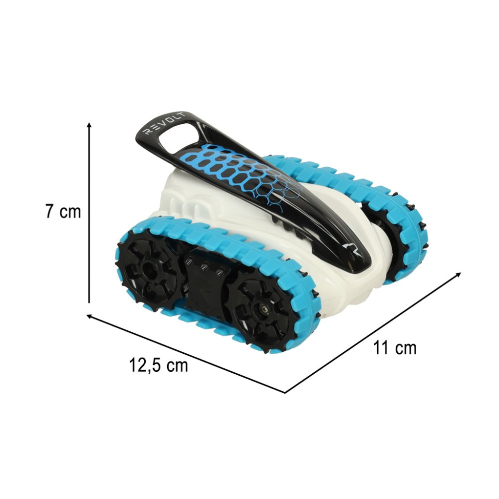 The REVOLT Biotrax SM remote-controlled car is the perfect choice for young automotive enthusiasts. Equipped with a durable tracked chassis, this vehicle effortlessly handles various surfaces, ensuring dynamic play. Its futuristic design and lighting effects add a unique character to the car. The vehicle is controlled with a 2.4 GHz frequency controller, providing a stable connection and full control within a 20-meter range. The car reaches speeds of up to 8 km/h.