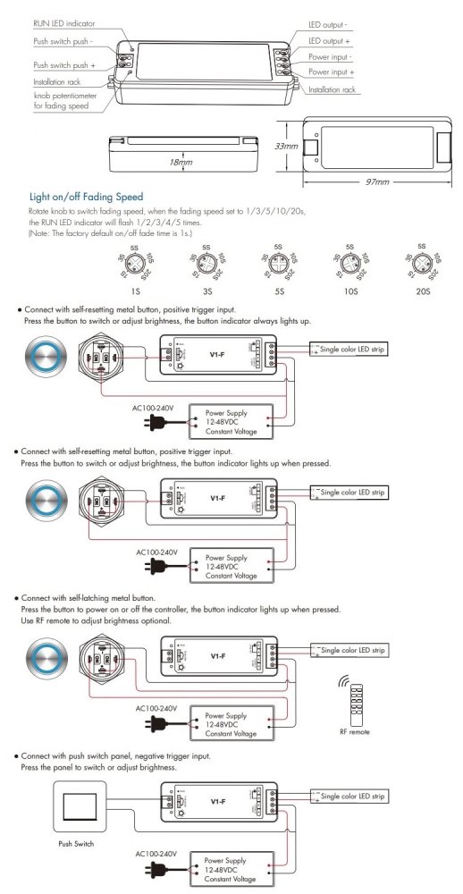V1-F LED Dimmer Controller 12-48V 8A Fade-in Fade-out Push-Dimm