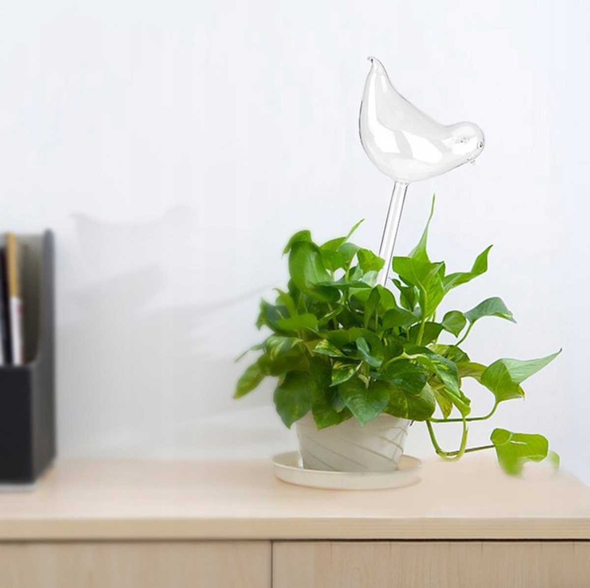 Plastic irrigator for potted plants in the shape of a bird. Ensures that have adequate access to source water, even during long absence. Attractive appearance is an additional decoration our balcony or garden.