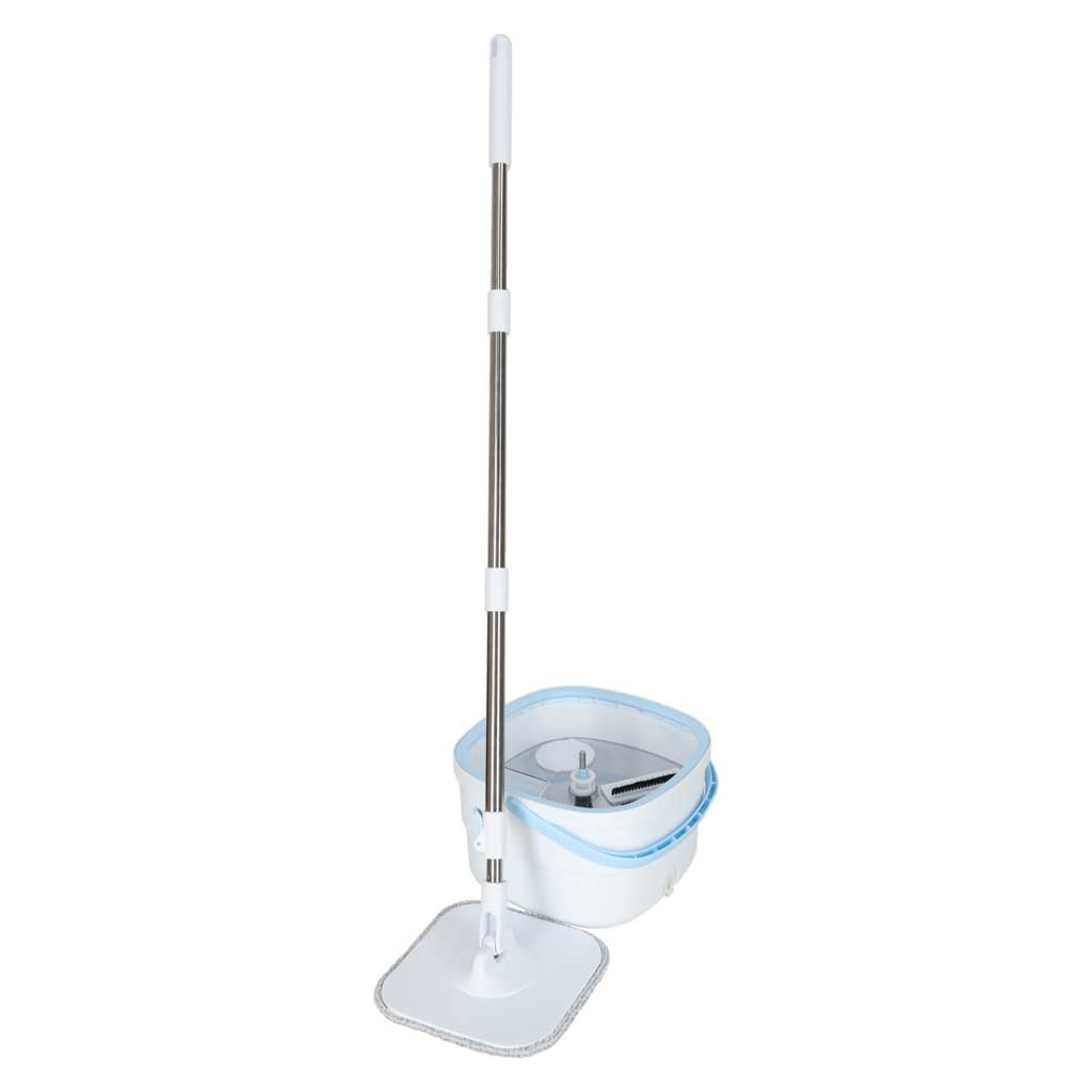 - Set includes: dual-chamber bucket, rotating system, telescopic handle, 2 microfiber pads