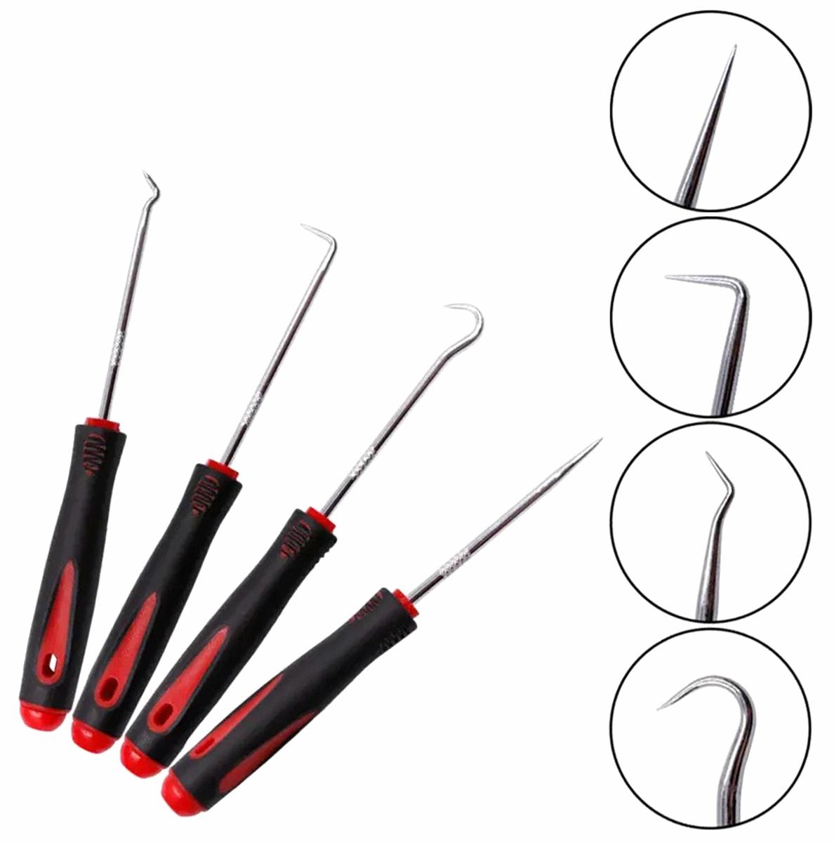 Set of 4 universal tool hooks for gaskets and orings. They make it easy to lever, pull manipulate hard-to-reach rubber parts. Handy handles allow handling each hook. Rugged, hardened steel allows long trouble-free use.