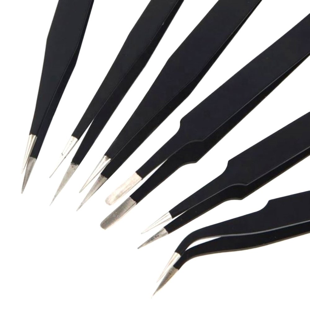 This professional precision tweezer set is designed for detailed service applications, electronics repair, and modeling. The kit includes 6 straight and angled tweezers, an essential tool for any electronics technician or hobbyist. They are perfect for delicate tasks like prying ICs or handling tiny components with accuracy.