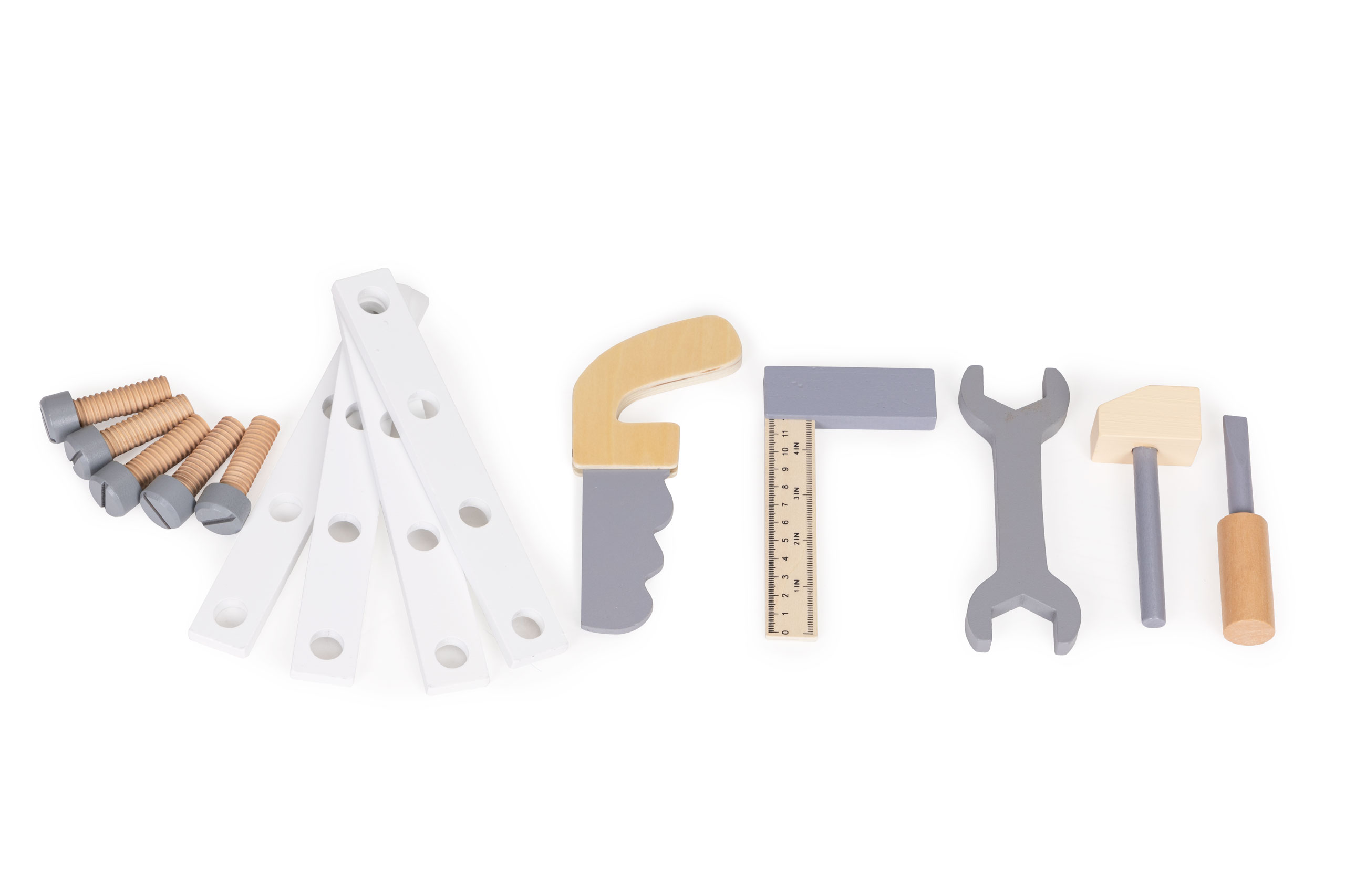 All tools and accessories are made of wood, coated with safe paints, and are free of sharp, dangerous edges.