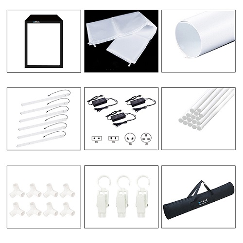 Comes with a carrying bag and one (270x120cm) white background paper board. The paper board is wrinkle resistant and water resistant.