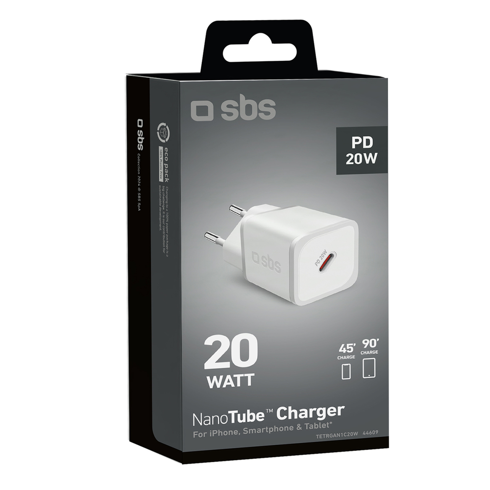 The Sbs TETRGAN1C20W is a modern and compact wall charger that utilizes GaN technology to deliver maximum power in a minimal size. It is perfect for home, office, and travel use.
