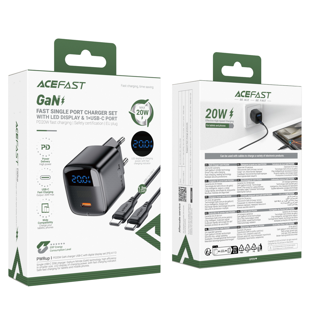Power up your devices quickly and safely with the Acefast A113 GaN 20W charger. This sleek black wall adapter features advanced GaN technology and a built-in display to monitor your charging status in real-time.
