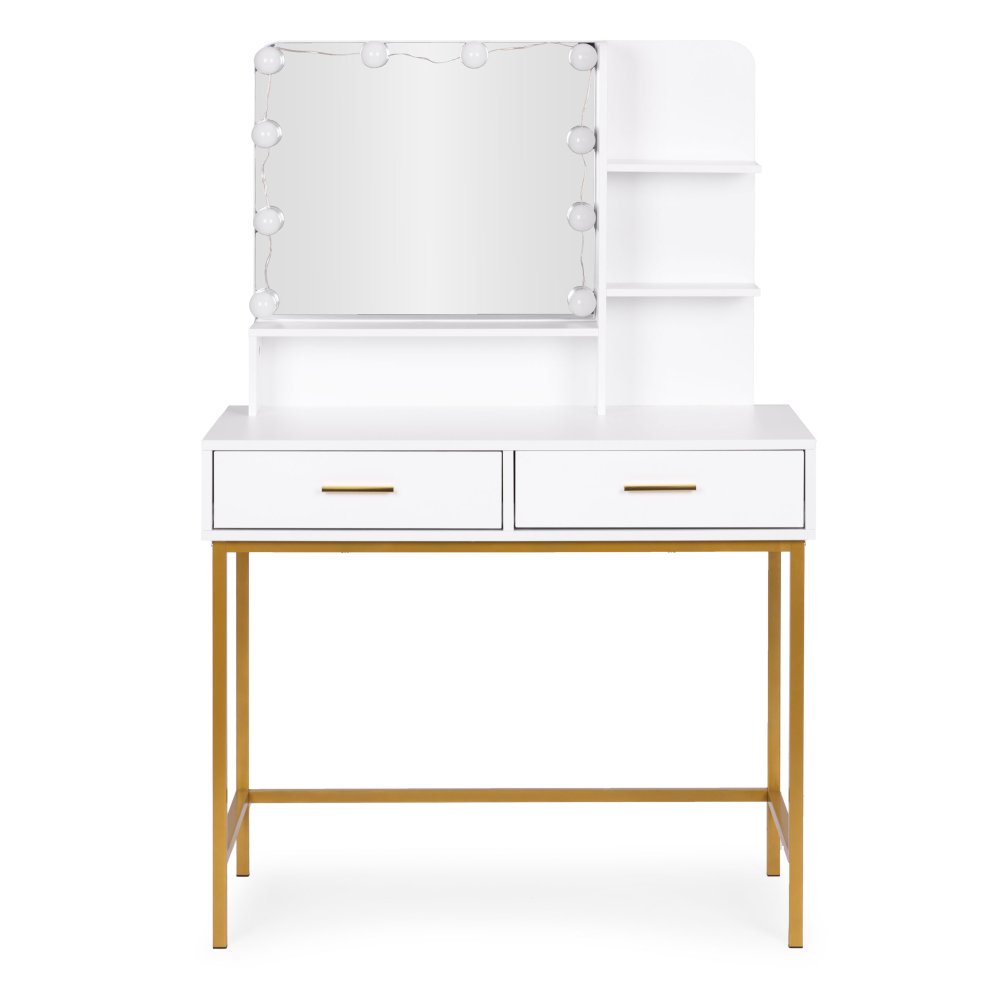 The ModernHome vanity desk is more than just furniture—it's your personal space for daily beauty rituals. Its chic white and gold design adds a touch of modern elegance to any bedroom or dressing room. Two large drawers and open shelves provide ample storage, keeping your makeup, jewelry, and accessories neatly organized and within reach.