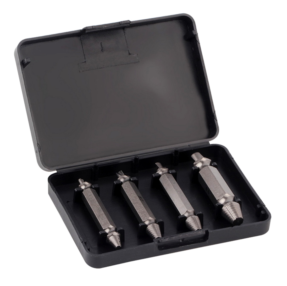 This set includes 4 screw extractors in different sizes, designed for removing broken or seized screws and studs. Made from durable tool steel, these extractors withstand high stress and ensure long-lasting performance. The universal set covers the most common screw sizes, making it easy to remove damaged or rusted fasteners. All tools are neatly packed in a compact, sturdy plastic case.