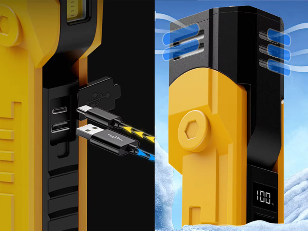 With a built-in magnet and a bottom hook, you can easily mount the flashlight anywhere, keeping your hands completely free to work. This mechanic light also doubles as a powerbank, allowing you to charge your phone or other devices on the go. A convenient LCD display keeps you informed about the battery level.