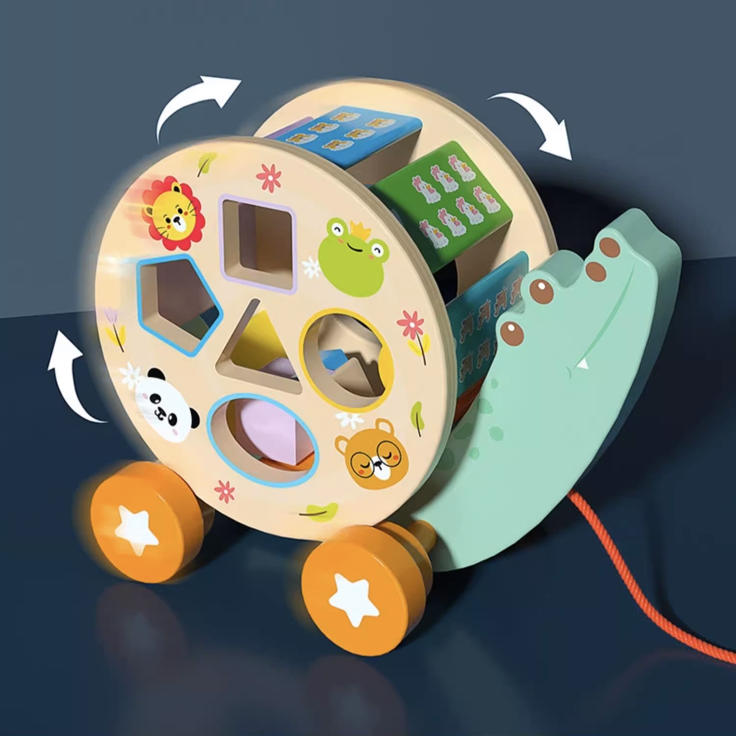 - Interactive Movement: The sorter cylinder rotates as the crocodile is pulled across the floor.