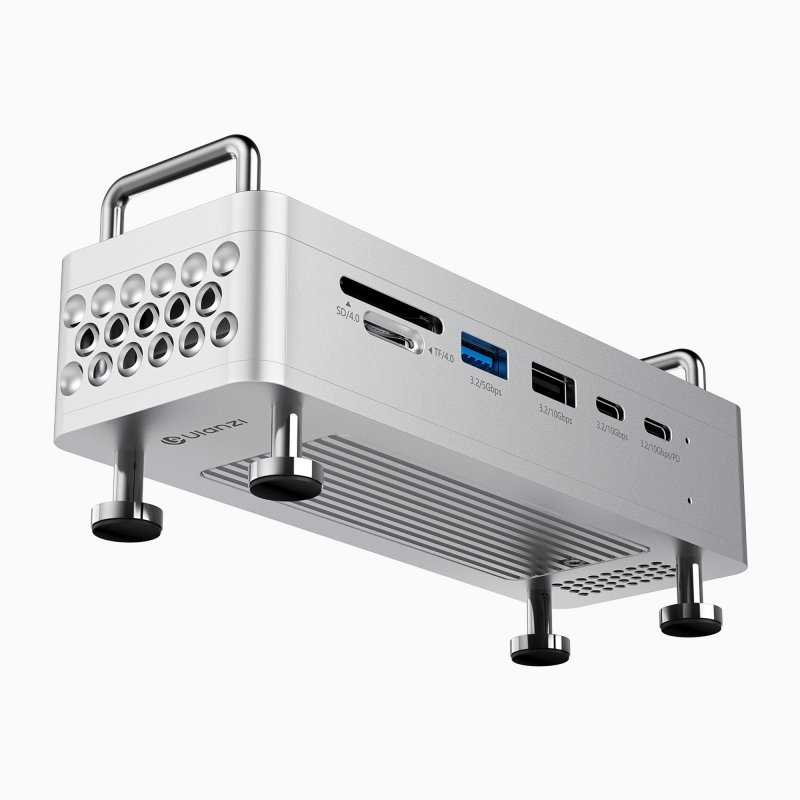 Ulanzi QT03 ir ierīce tiem, kuri novērtē kārtību, funkcionalitāti un elegantu dizainu. Tā vietā, lai lietotu vairākas atsevišķas ierīces – ārējo disku, karšu lasītāju, lādētāju un hubu – jums nepieciešama tikai viena dokstacija. Šī ierīce ne tikai paplašina jūsu datoru ar 10 pieslēgvietām. Dokstacijas iekšpusē ir speciāls nodalījums ātram M.2 NVMe diskam ar ietilpību līdz 8 TB. Ar Ulanzi QT03 viss ir pa rokai, ievietots elegantā alumīnija korpusā, kas lieliski izskatās blakus Mac Mini, klēpjdatoram vai monitoram.