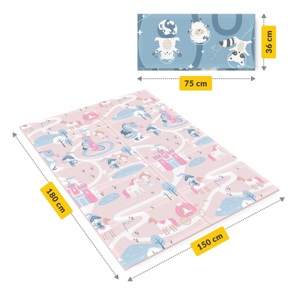 Šis paklājiņš ir izstrādāts, lai atbalstītu bērna sensoro un motorisko attīstību. Pateicoties divpusējam dizainam ar "Królestwo i Kosmos" (Karaliste un Kosmoss) motīviem, tas rosina iztēli un padara rotaļas aizraujošākas. XPE putu materiāls efektīvi amortizē kritienus, nodrošinot drošību aktīvu rotaļu laikā.