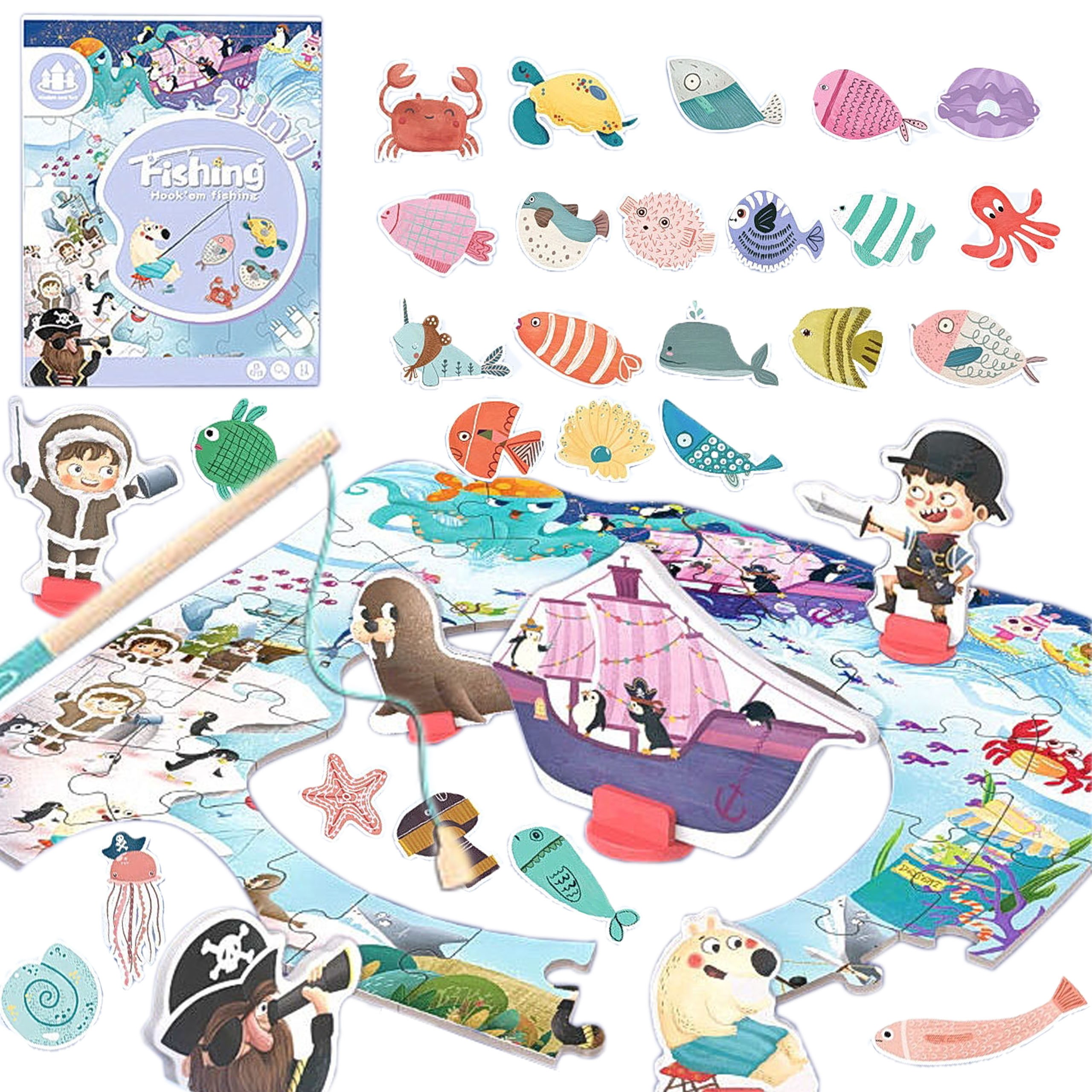 Krāsaina makšķerēšanas spēle apvienojumā ar puzli ir lieliska rotaļlieta bērniem, kas palīdz attīstīt roku-acu koordināciju un pacietību.